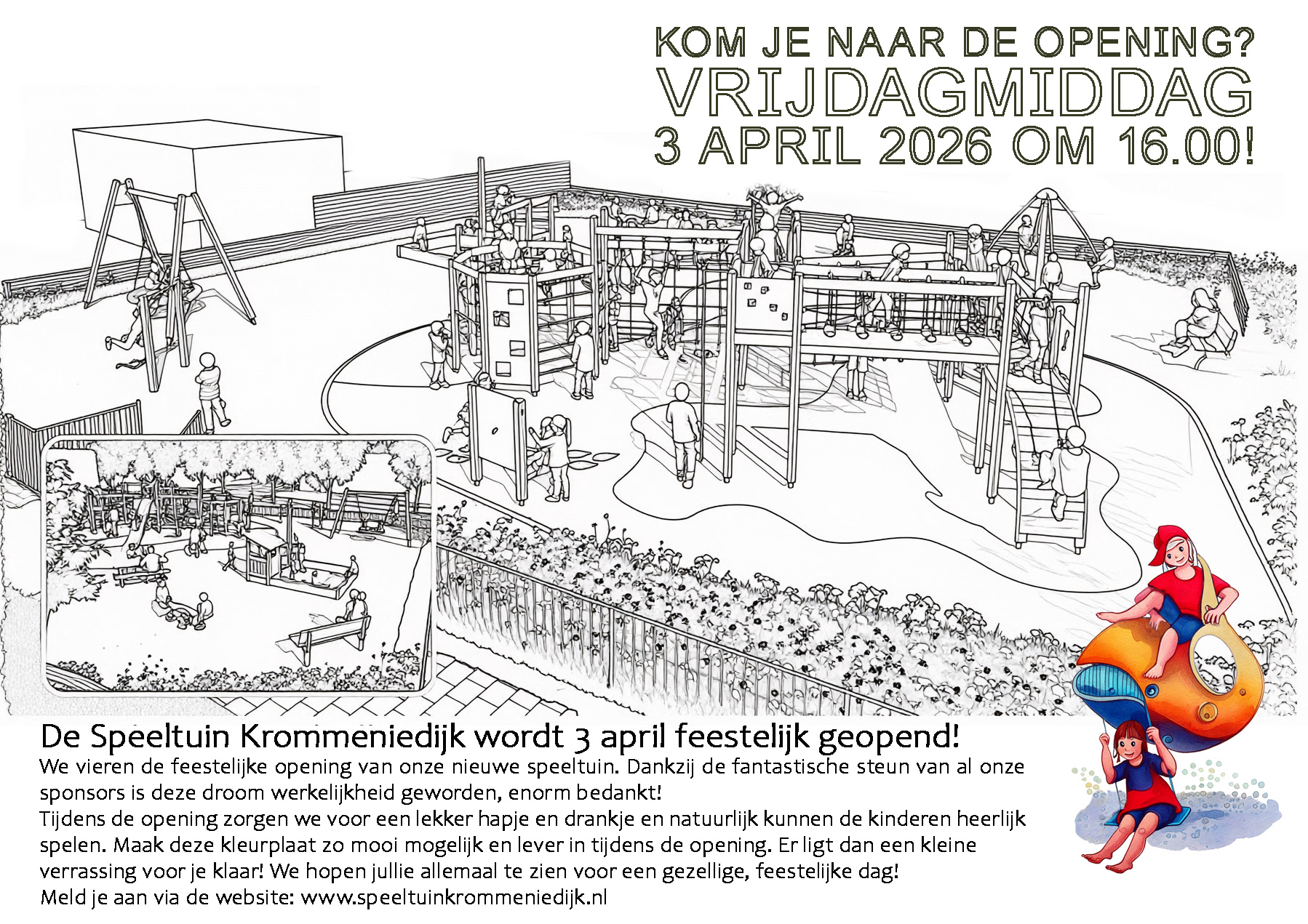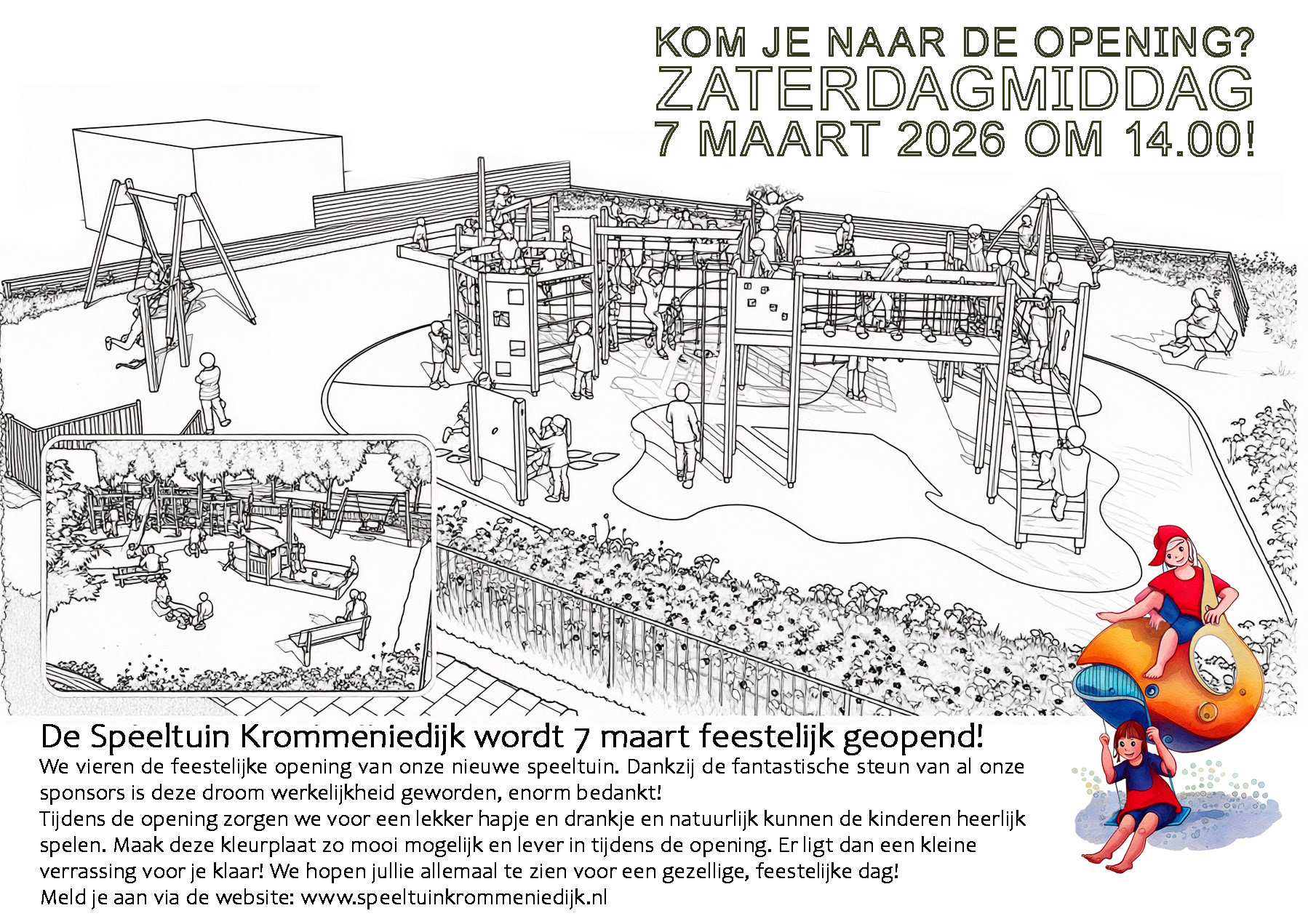 We vieren de feestelijke opening van onze nieuwe speeltuin. Dankzij de fantastische steun van al onze sponsors is deze droom werkelijkheid geworden, enorm bedankt! Tijdens de opening zorgen we voor een lekker hapje en drankje en natuurlijk kunnen de kinderen heerlijk spelen.