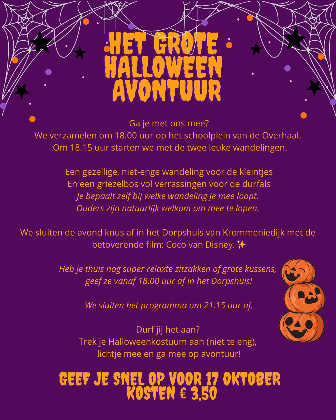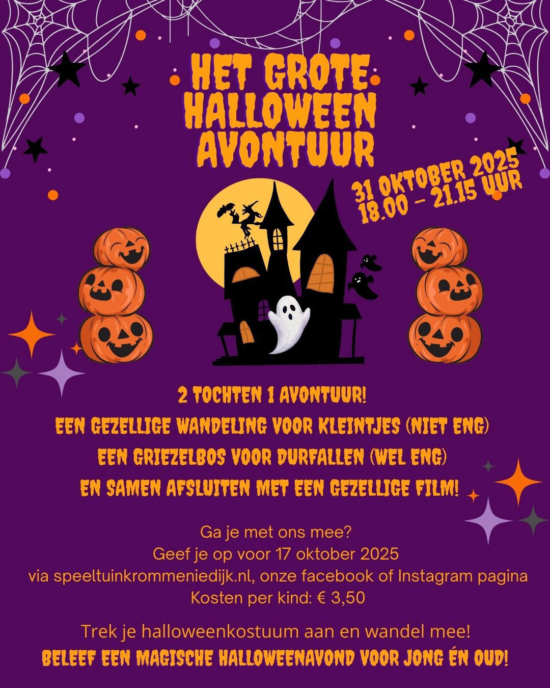 Op vrijdagavond 31 oktober zijn we weer op avontuur geweest. We hebben met 85 kinderen gegriezeld, gelachen en gegild! Maar vooral heel erg genoten van de spooktocht en film.